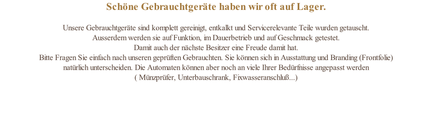 Das Modell XS ist ein sehr robustes Table Top Modell . Der Automat macht 8 Kaffee und Kakao Spezialitäten und hat einen eingebauten Wassertank mit ca 3,5L. Die Möglichkeit eines Münzprüfers sowie Fixwasseranschluß ist gegeben.